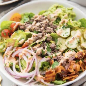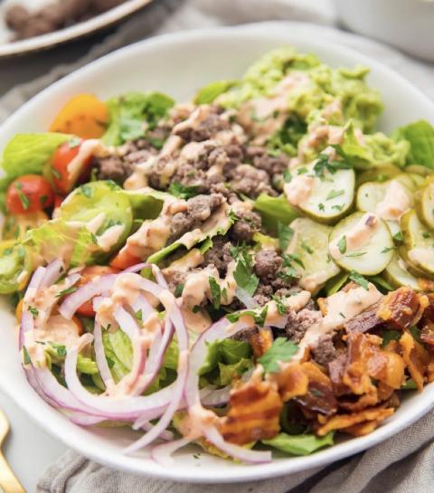 Ingredients: spring mix blend, loaded with pickles, bacon, tomato, red onion, and a keto “special” sauce!