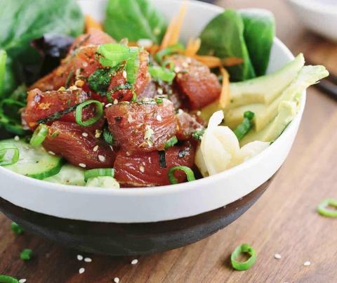 Fresh Ahi tuna marinated in soy ginger sauce. Bowl fixings- Cucumber base with cabbage and carrots. Topped with chives & sesame seeds served with a side of wasabi and guacamole.