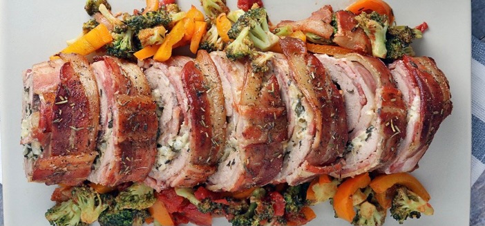 Pork tenderloin stuffed with sautéed on and spinach with cream cheese then wrapped in hickory smoked bacon and baked. Served with mixed vegetables.