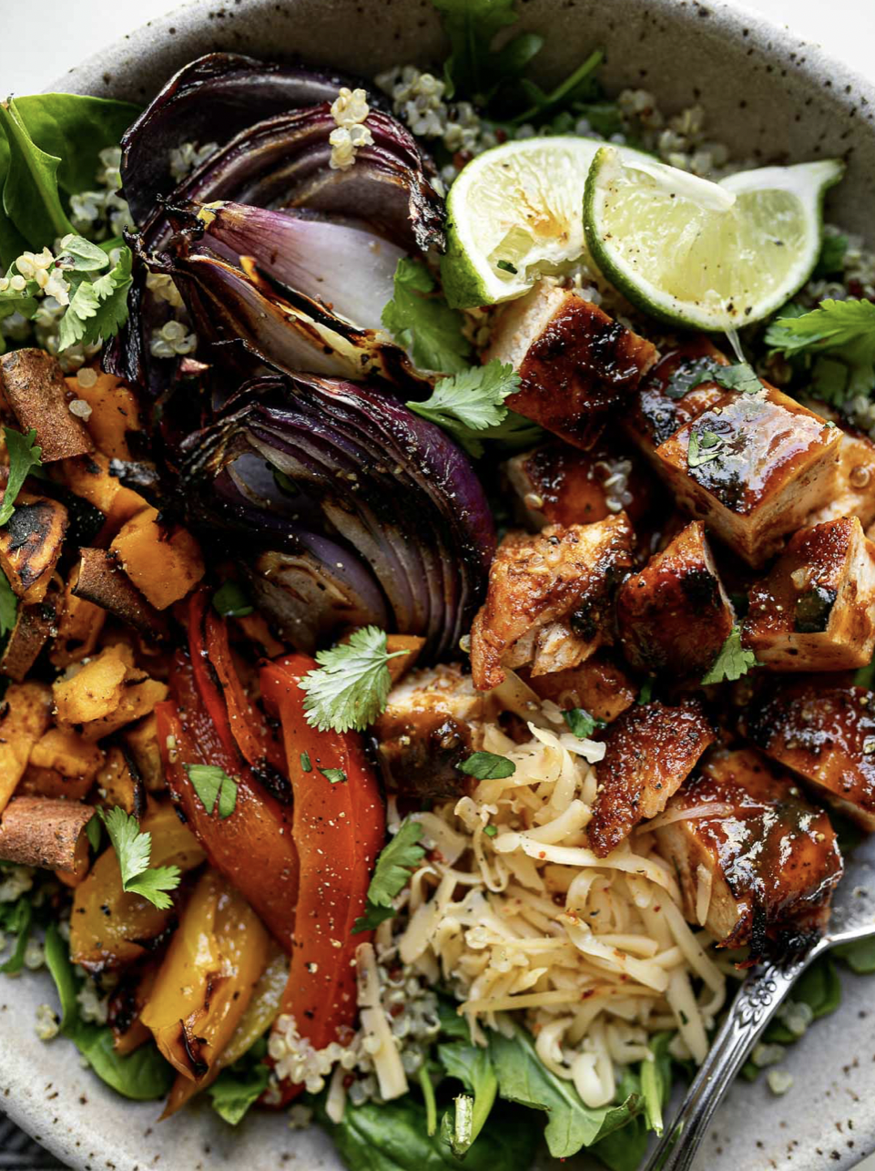 Grilled chicken, sweet potatoes, peppers, & onions are loaded up in a flavorful & colorful BBQ chicken bowl with greens and a sprinkle of shredded cheese, can be made dairy free.