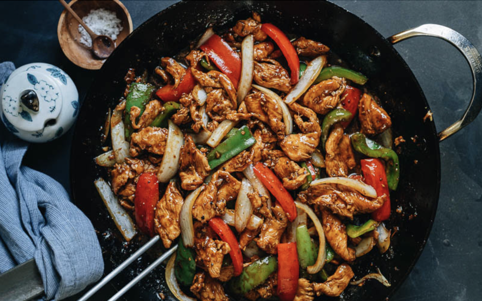 Black pepper chicken with juicy tender chicken, crisp vegetables and a rich savory black pepper sauce.