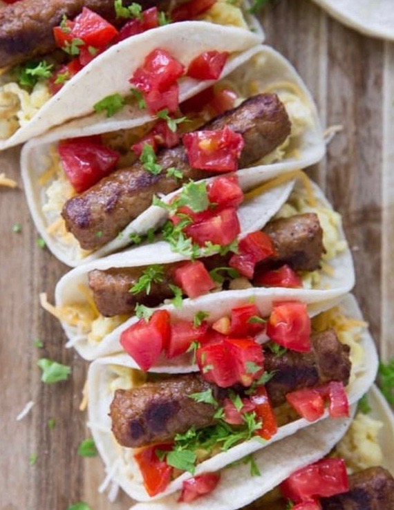 Whole eggs, spices, turkey sausage, corn tortilla, fruit, tomato