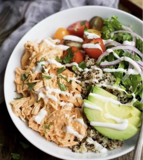 Slow-cooked free-range organic chicken breast in a house-made buffalo sauce served over a bed of quinoa with tomato, kale and red onion.