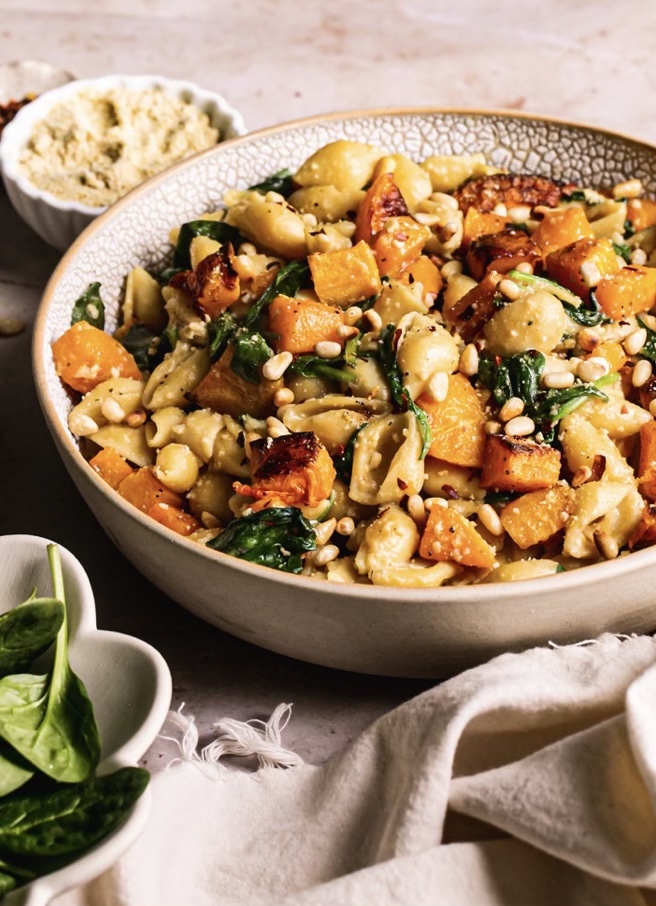 Butternut squash shells are the ultimate fall comfort food! with creamy spinach ricotta, sage ground turkey, asiago cheese and fresh herbs.