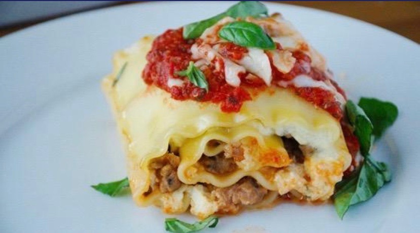 Ricotta, mozzarella, parmesan and lean ground beef with fresh herbs and spices rolled into a lasagna noodle topped with tomato basil marinara and topped with mozzarella and asiago blend served with a side of broccoli