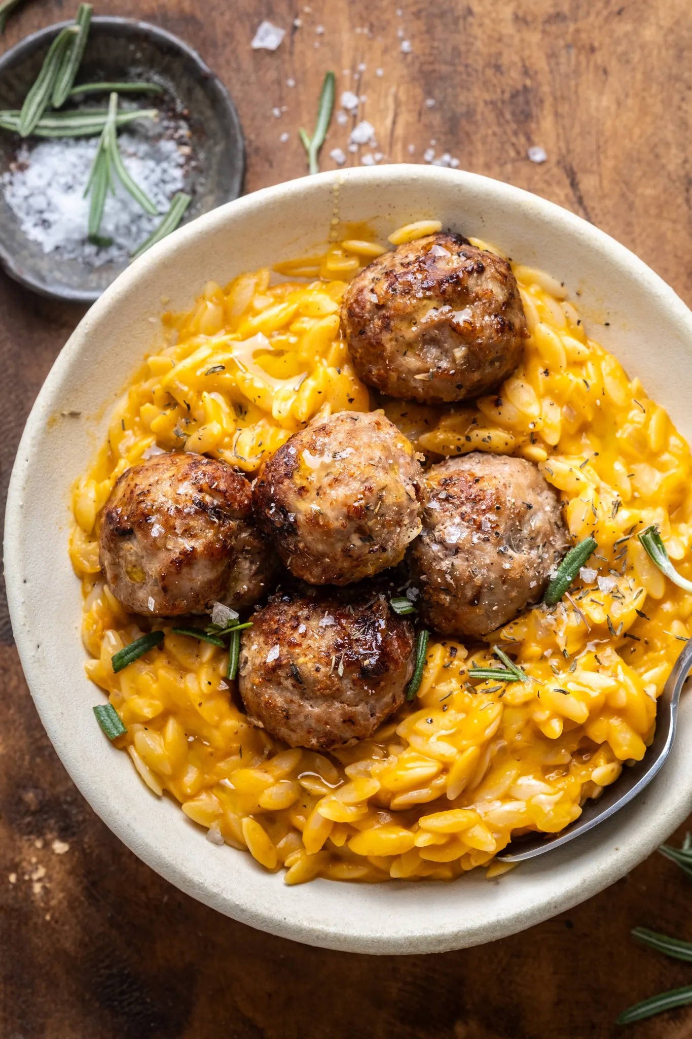 Delight in the fresh, vibrant flavors of our Lemon Thyme Beef Meatballs, featuring juicy meatballs infused with zesty lemon and aromatic thyme. Served alongside a unique and creamy Pumpkin Orzo, this dish brings a perfect blend of savory and seasonal flavors. Accompanied by a medley of fresh, seasonal veggies.
