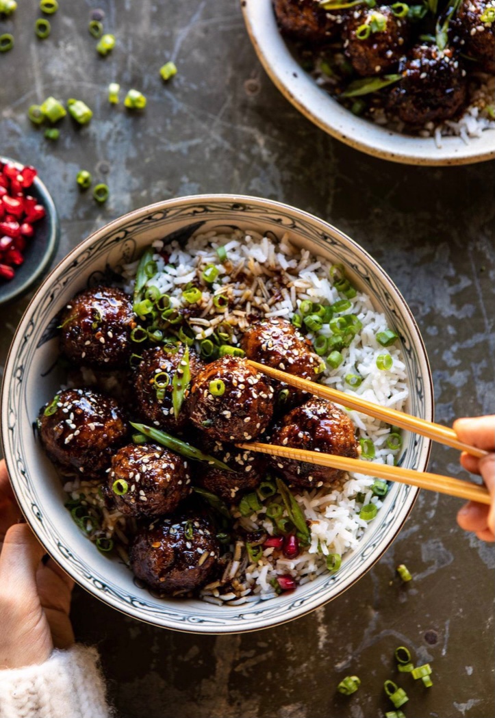 Sesame ginger beef meatballs tossed in a sweet, spicy and extra sticky soy sauce. Served over steamed rice topped with sesame seeds and served with roasted vegetables.